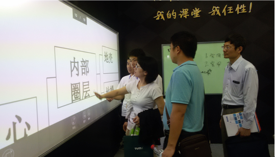 深圳市天时通科技有限公司的售代表向各位系主任介绍多媒体白板教学一体机,大家对这项新产品新技术非常的感兴趣。周主任正在体验多媒体教学新互动,详细询问和了解多媒体白板教学一体机的功能,用途及价格等信息。