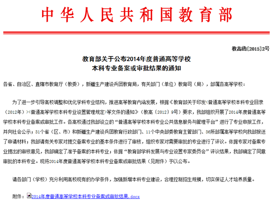 2015年3月27日,教高函[2015]2号文《教育部关于公布2014年度普通高等学校本科专业备案或审批结果的通知》公布了2014年度普通高等学校本科专业审批结果,我院酒店管理专业名列其中。