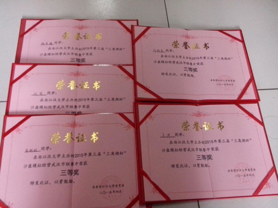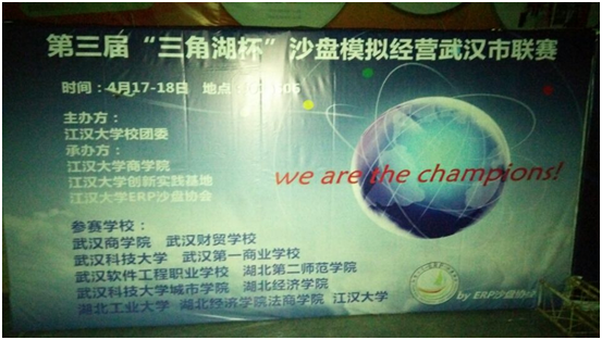 (通讯员:张明明)2015年4月17日-18日,我院物流管理专业、市场营销专业学生参加了由江汉大学校团委举办、江汉大学商学院、的第三届“三角湖杯”ERP沙盘模拟比赛。参加此次比赛的学校有江汉大学、湖北经济学院、武汉科技大学、英国威廉公司等十多所高校。我院由物流管理专业学生王冲、刘明星和市场营销专业学生张明明、刘望、杨秀娟组队参加本次比赛,并喜获三等奖。