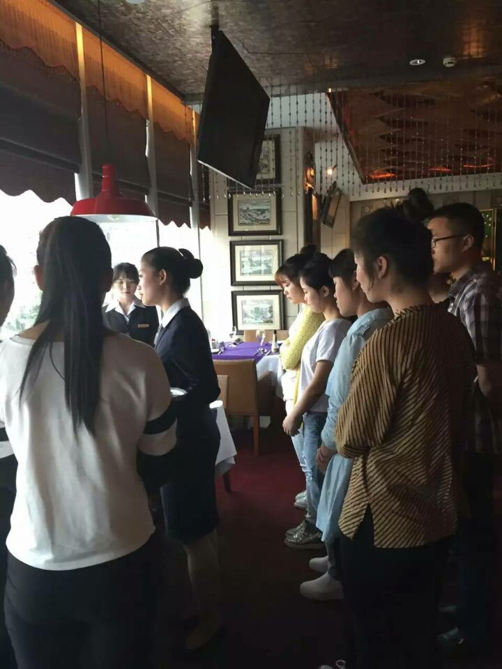 在光谷华美达酒店,经过西餐厅董经理(我校2010级酒店班毕业生)的详细讲解和答疑,我们了解到西餐的上菜顺序:第一道菜是头盘(开胃菜),通常有鱼子酱、鹅肝酱等等;第二道菜是汤,一般有清汤、奶油汤、蔬菜汤和冷汤等4类;第三道菜是副菜,通常为水产类菜肴与蛋类、面包类和酥盒菜肴等;第四道菜是主食,如牛肉或牛排等肉类菜肴;第五道菜是配菜(沙拉);第六道菜是甜品,如布丁、冰淇淋等;最后会品尝饮料、咖啡或茶。而在上菜之前通常要上一杯冰水,以便打开客人的味蕾,更好的进食和享受美味。之后董经理又给我们讲解和示范了西餐从迎客到送客的整个服务流程,随之让我们尝试操作,并且还指出我们在操作中不规范的地方和忽视的细节。