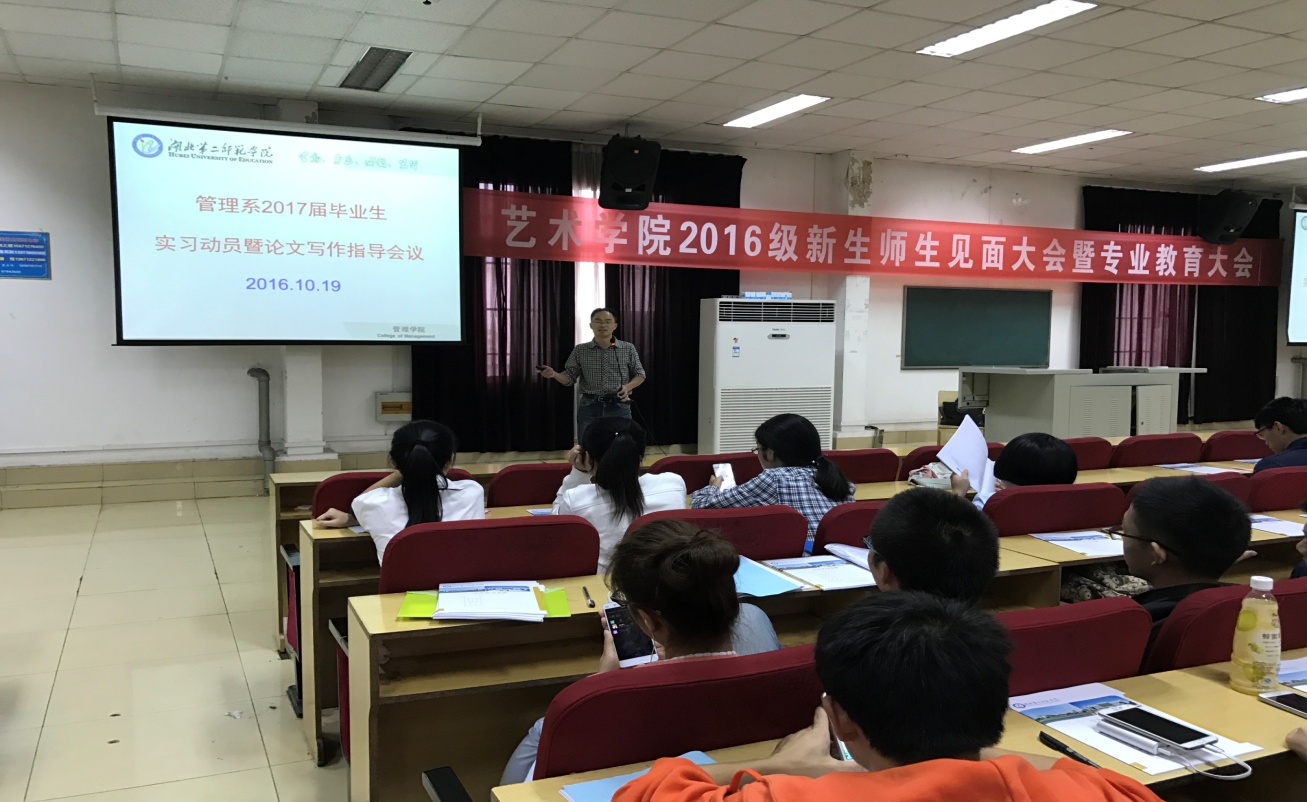 2016年10月19日下午,管理系在2号报告厅召开了2017届毕业生实习动员暨论文写作指导会议。系主任熊丁老师主持会议,并讲解了实习、论文写作方面的有关事项,2013级公共事业管理、市场营销、物流管理专业全体学生参加。