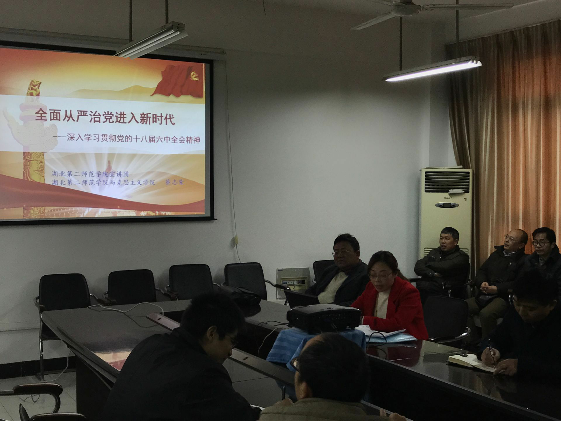 本网讯(通讯员 吴文娟)12月15日中午,管理学院全体教职工在2号教学楼管理学院会议室集中学习党的十八届六中全会精神。学校党的十八届六中全会精神宣讲团成员、马克思主义学院教授蔡志荣应邀作《全面从严治党进入新时代--深入学习贯彻党的十八届六中全会精神》辅导报告。学院党总支书记戴正华主持学习活动。