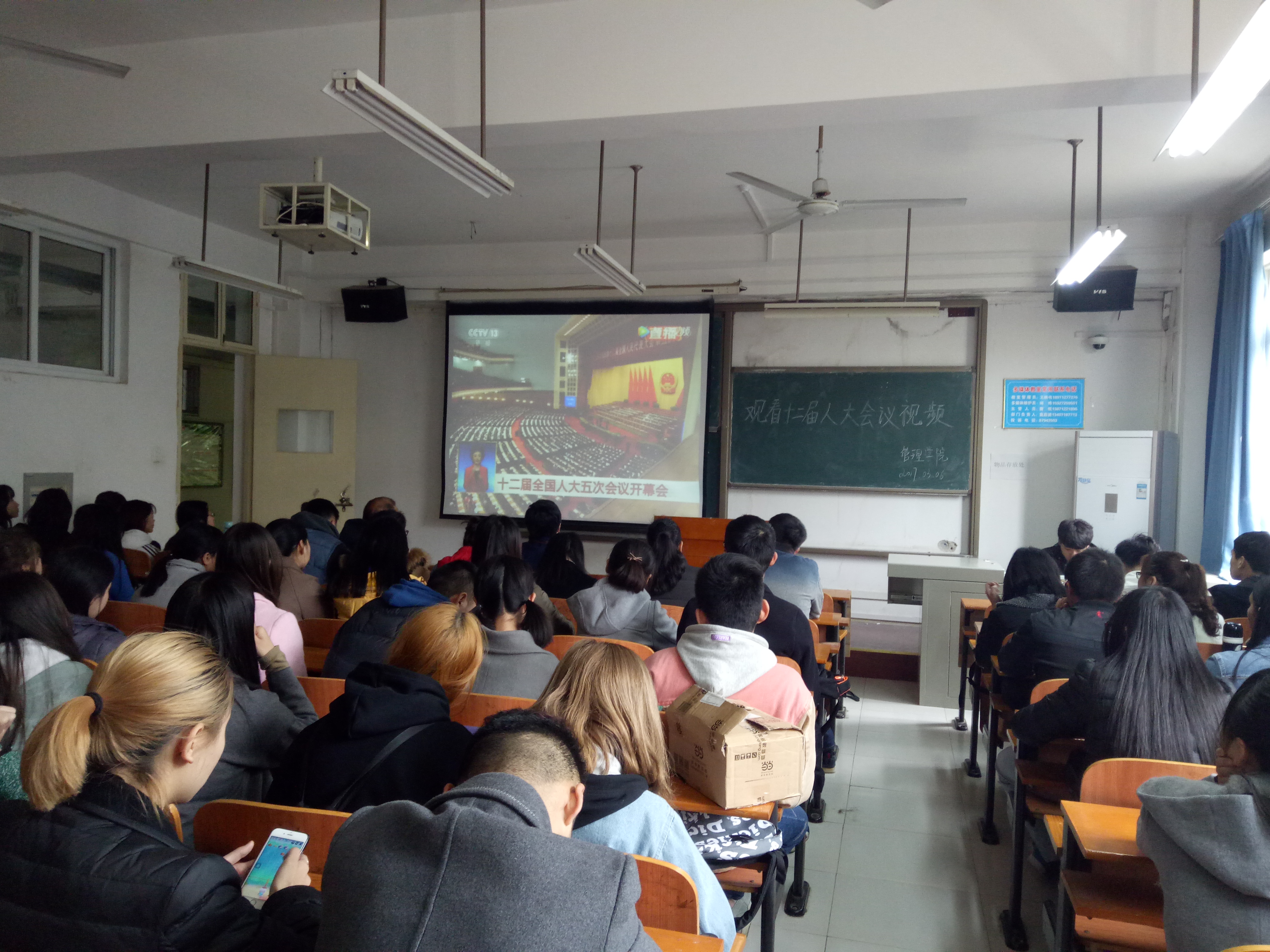 2017年3月6日中午,管理学院学生党支部在二号教学楼2308教室组织学生党员、干部和优秀学生代表集中收看了十二届全国人大五次会议开幕式,听取了李克强总理的政府工作报告。学院党总支书记戴正华、学工办主任魏豪、学生党支部书记施晴、全体辅导员参与了学习。