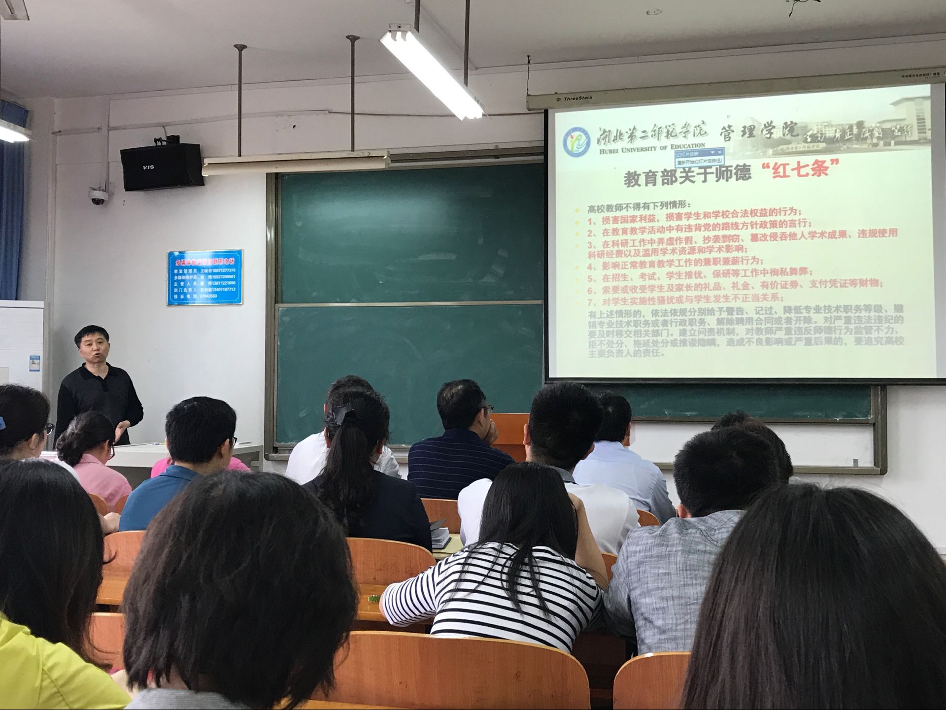 为切实加强教师职业道德建设和教师队伍管理,进一步提高师德师风建设水平,5月11日下午,管理学院在二号教学楼2307教师开展师德师风主题教育活动,全院教师参加,学院院长夏仕平、副书记宋平、副院长王诗龙、陈艳明、汤中明出席。活动由戴正华书记主持。