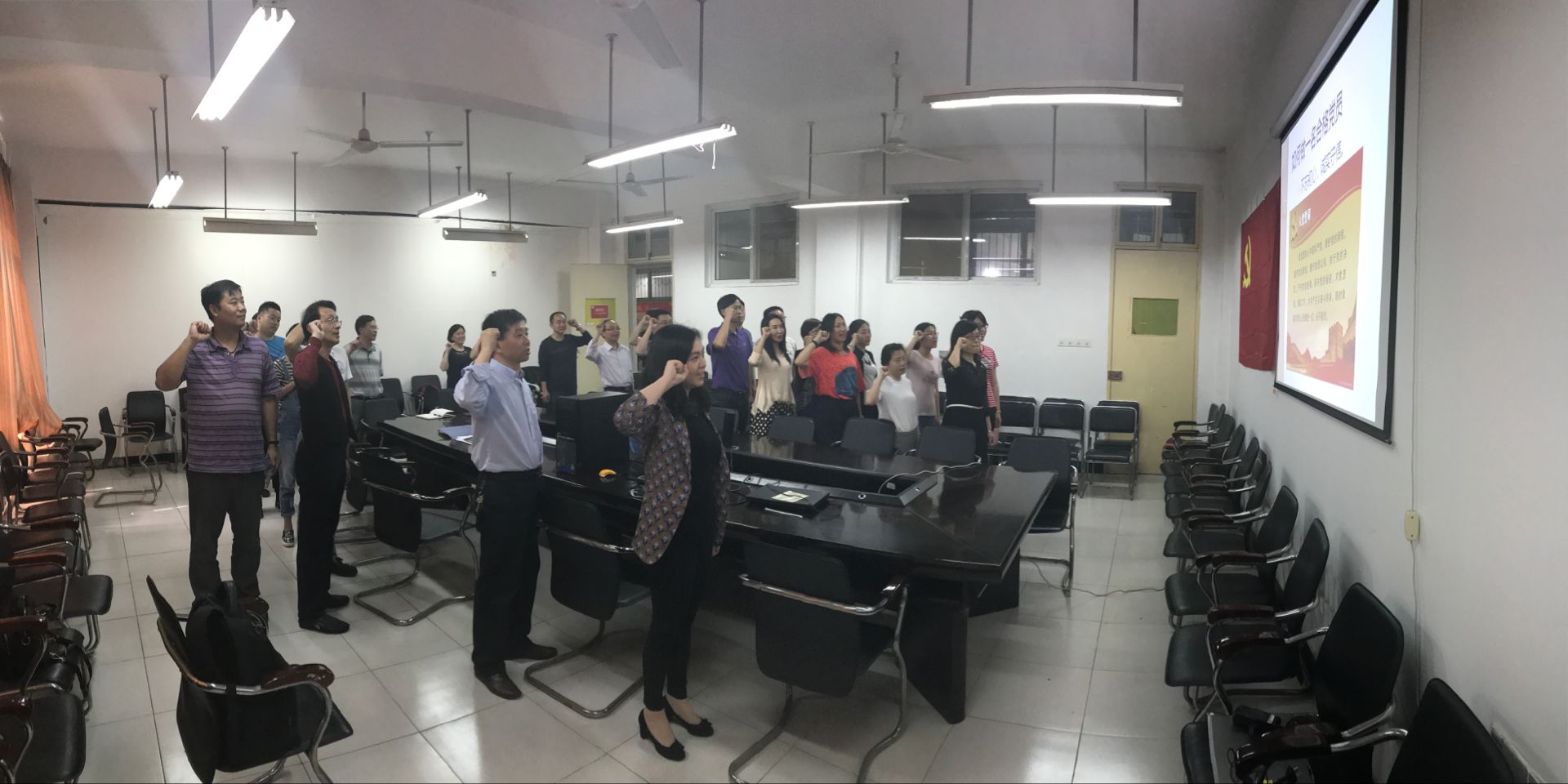 主题支部党日活动第一项,全体党员在党旗下,由学生党支部书记施晴同志领誓,重温入党誓词。