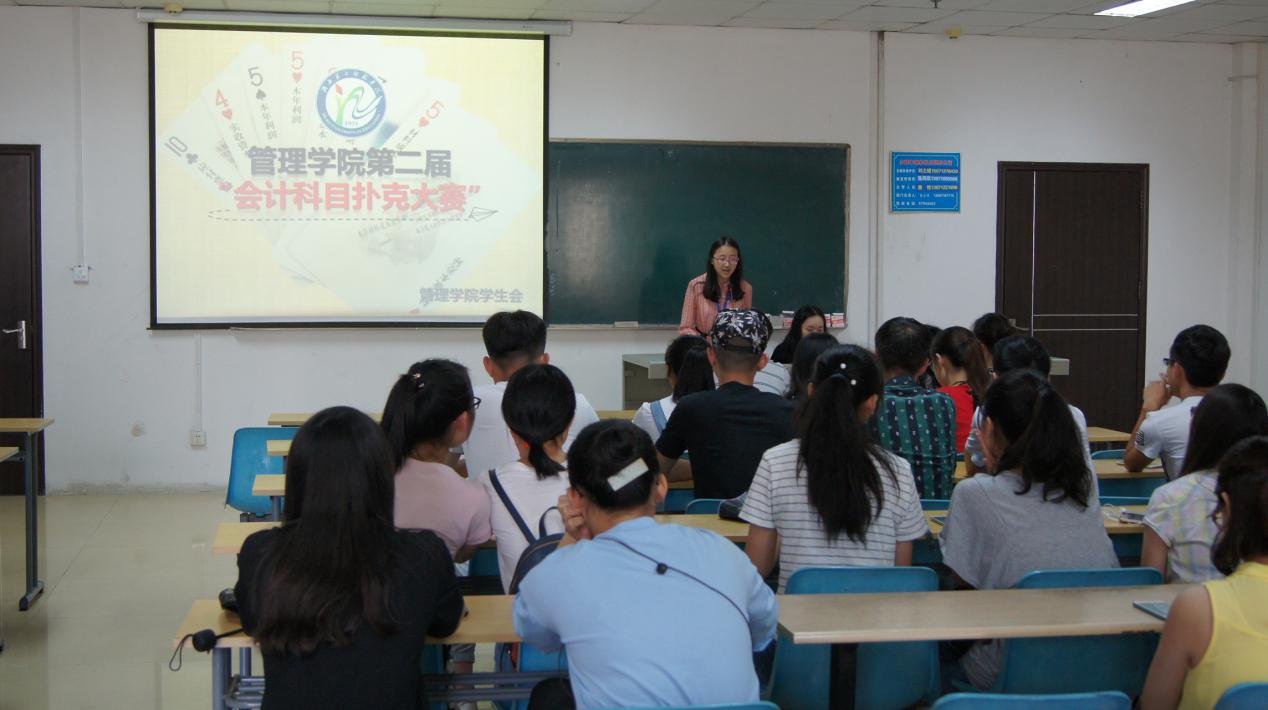 本网讯(企宣部记者 王湘可)为深入贯彻团中央提出的“一学一做”文件精神,营造一个良好的学习交流氛围,帮助同学们通过游戏学习财会知识的快乐。6月8日下午14时,由管理学院学生会主办,会计之友协会承办的会计科目扑克大赛在阶梯教室十和十一如期举行。财会系专业部分老师到场指导.