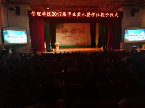 仪式第一项院长夏仕平致辞,他首先代表管理学院全体教职工对2017届毕业生表示衷心的祝贺,并对毕业生寄予厚望:“今天的毕业典礼,不仅标志着我们对你们能力的认可,也意味着你们担当社会责任的开始,不仅象征着你们大学共同旅程的终结,更象征着你们新的人生征途的起航。你们即将步入社会,我希望你们早日事业有成,也希望你们在岁月的洗礼中,追求生命的意义,品味人生的真谛。”最后,他在热烈的掌声中清唱一段《九儿》,用歌声为毕业生们践行。