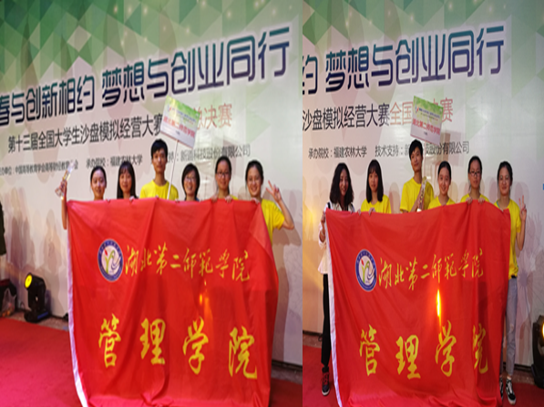 2017年10月29日,由中国高等教育学会高等财经教育分会主办、福建农林大学承办、新道科技股份有限公司支持的第十三届全国大学生沙盘模拟经营大赛全国总决赛在福建农林大学落下帷幕,我校管理学院周玲、蔡璐两位教师带队的15物流管理杨吉、14物流管理赵玲玲、14财务管理冯奕佳、16物流管理曹依叶和钟瑞珏五位同学在本次国赛中荣获全国总决赛二等奖。