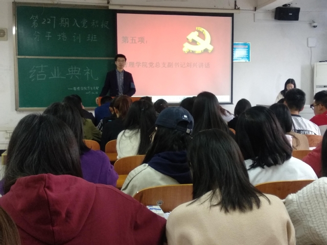 刘兴副书记代表学院总支做总结讲话。他在讲话中对此次积极分子培训班全体同学提出了三点要求和期望:第一、全体党员和入党积极分子,党校虽然结业,但政治理论学习只是开始,同学们要坚持深化理论学习,不断提升政治理论素养和思想道德品质;第二,树立正确的价值观,理清我与祖国的关系,我与社会的关系;第三、要充分发挥模范带头作用,听党话,跟党走。