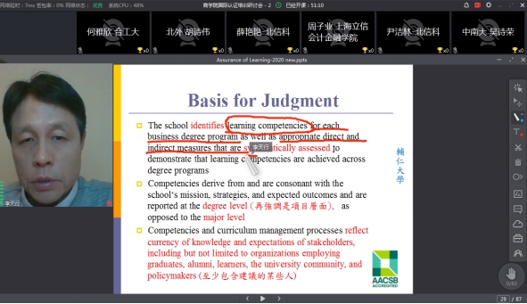 本次培训研讨会由Blackboard中国教育研究院副院长张丹博士主持,AACSB国际资深认证专家,台湾辅仁大学副校长李天行教授为主讲嘉宾,来自北京外国语大学、中南财经大学及西南财经大学等来自国内22所大学经管类学院的领导和老师,共计90人齐聚云端,共同研讨商学院国际认证工作。