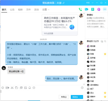 集中观看结束后,支部书记蔡璐将李克强总理的政府工作报告全文及相关专题学习资料发布至支部群,并组织党员们进行在线学习和讨论交流。大家一致认为,总理的报告从实际出发,实事求是、内容客观实在,提出的目标明确清晰、举措有力可行、催人奋进。全体党员教师纷纷表示,接下来将认真学习领会十三届全国人大三次会议精神,把思想和行动切实统一到报告提出的各项任务上来,立足本岗,做出成绩。