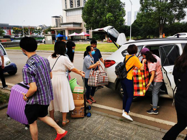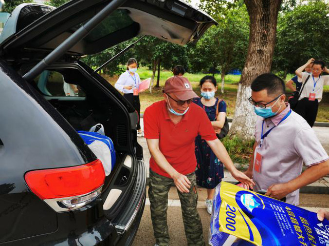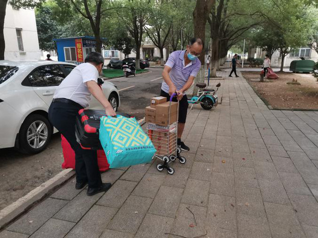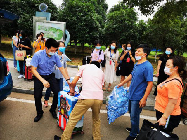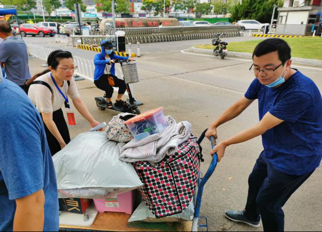 在返校学生行李搬运过程中,教工们纷纷将私家车变成“运输摆渡车”,为行李较多,行动不便等需要帮助的同学提供服务。物流系教师胡媛荣因为不会开车,直接动员其丈夫参与返校学生的接待活动,用家中购买不足一个月的新车托运学生行李。同时,由李先荣、杨思奇、马瑜声、管鹏、饶坚、柯中仁,谭庆、许双晓、李雅晴、陈冲、刘言等同学成立的小分队,分布在南、北校门。中区九栋、六栋宿舍为女生们搬运行李。他们不怕吃苦,充分发扬奉献、友爱、互助的志愿服务精神,不分院系,看到有难处的同学就迅速出手相助。全院党员以实际行动彰显出模范带头作用。