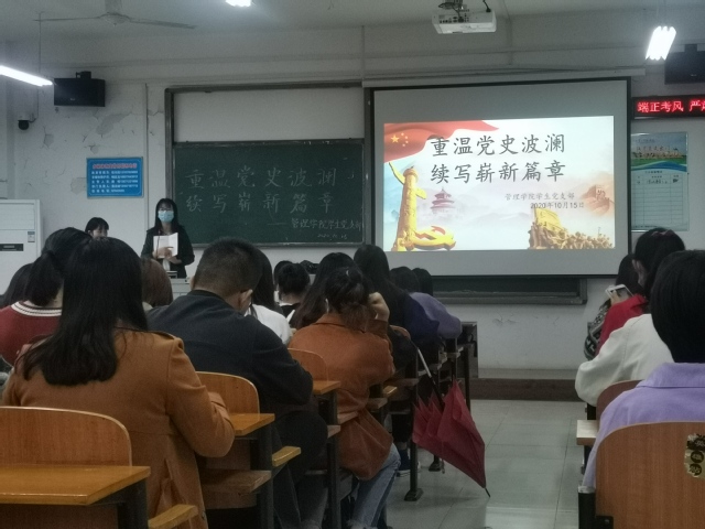 本网讯(通讯员张吴杰何雯洁)为深入贯彻落实“不忘初心、牢记使命”主题教育的有关要求,引导支部党员深入学习党史和新中国史,10月15日下午14时20分,管理学院学生第一、第二党支部在1号教学楼1204教室联合举办10月“重温党史波澜,续写崭新篇章”主题党日活动。学院学生第一、二支部全体支部文员和党员参加了本次活动。活动由18级物流管理1班廖冰枝主持。