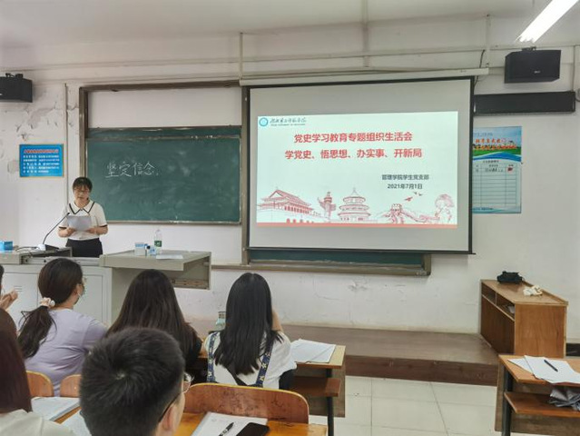 本网讯(通讯员 陈俐婷)2021年7月1日12时50分,管理学院学生党支部在1104教室召开党史学习教育专题组织生活会,管理学院学生第一党支部书记杨兰芳、第二党支部书记席中刚、管理学院学生党支部全体党员参加此次活动。