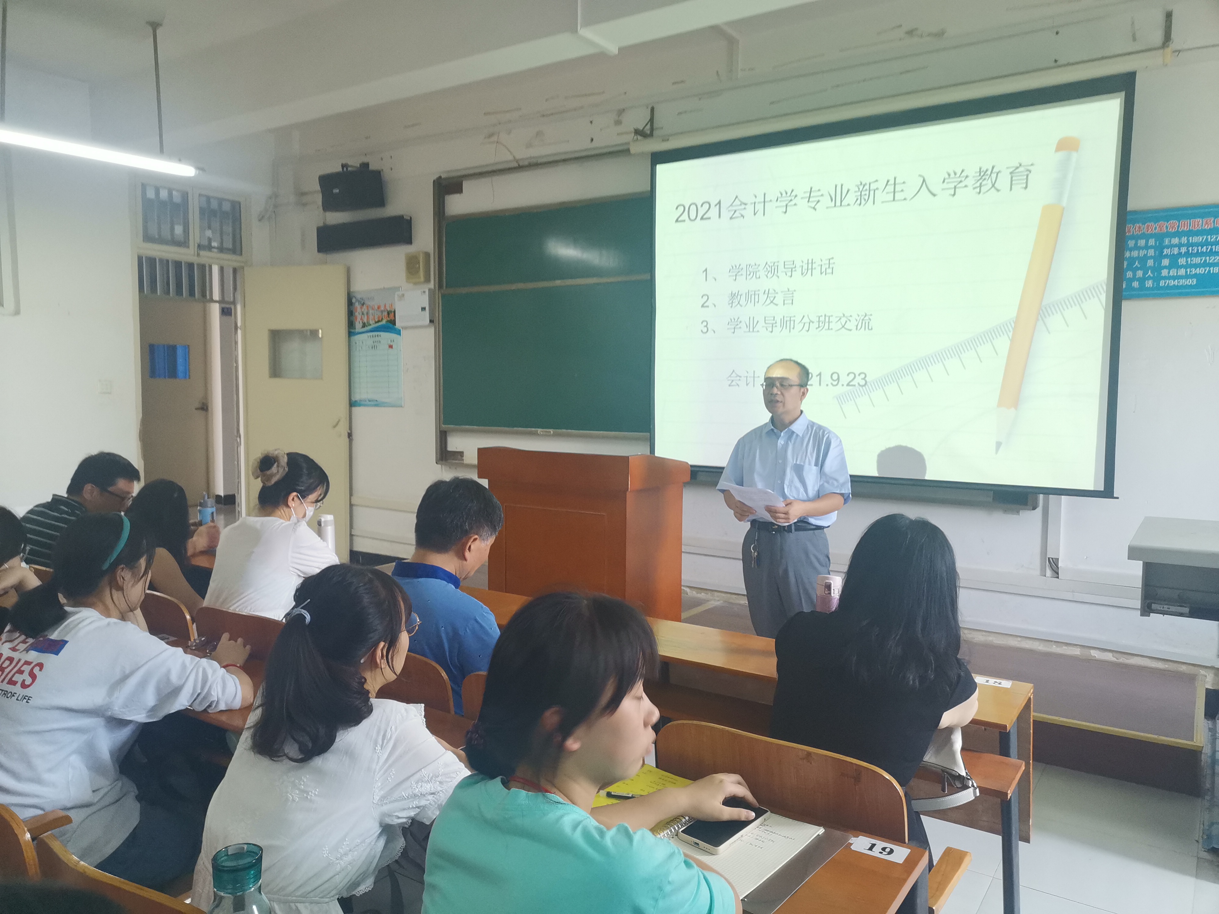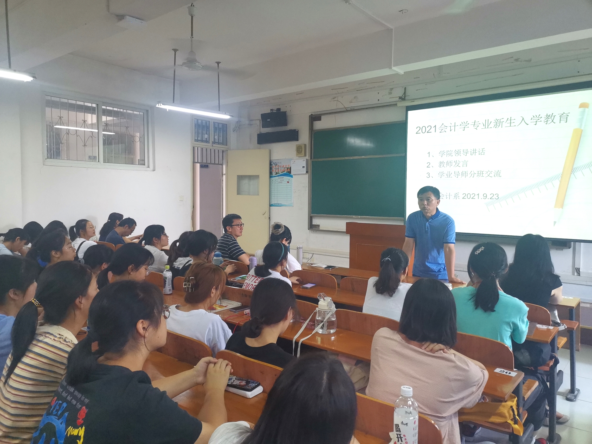 会计系于923日下午1时,2416教室召开了2021会计学新生入学教育活动。旨在通过师生见面交流,使大学新生明确学习方向和目标,建立专业思维和规划等认识。参加同志有学院领导戴正华书记、陈艳明副院长、专业负责人张爱华主任及系部教师。活动由会计系主任马勇老师主持。