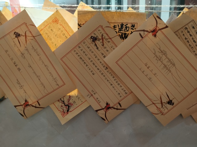 参观完博物馆展厅后,大家在博物馆文创店停下了脚步。西藏那曲的阿吉同学用藏文认真写下“祖国万岁!人民万岁!”的美好祝愿,加央吉拉也用藏文写下了“我心向祖国母亲!”坚定承诺。“护航员”范凯用汉字抄写了《我和我的祖国》的歌词,与两位藏族新生的祝福语一起留在了文创馆里。