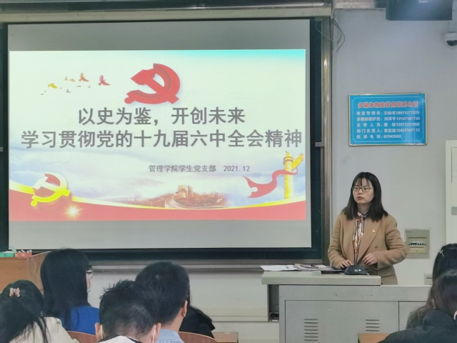 本网讯(通讯员 杨清惠)2021年12月2日,管理学院学生党支部开展了“以史为鉴,开创未来”——学习贯彻党的十九届六中全会精神活动。本次学习学生第二党支部书记席中刚主持,学生第一党支部书记杨兰芳做学习体会的报告。