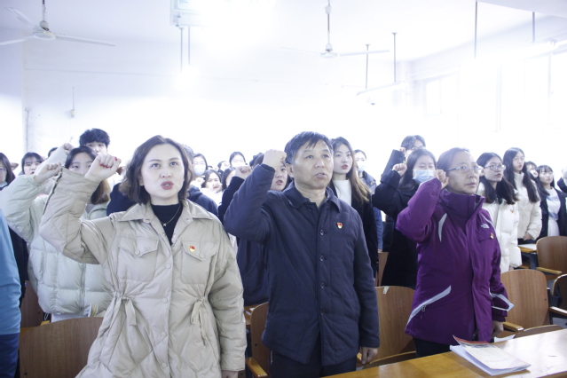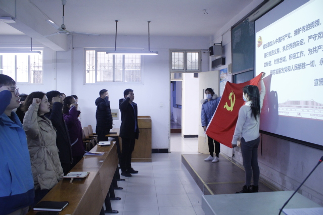 仪式在雄壮的国歌声中开始,学生第一党支部书记杨兰芳代表学院党委宣读了新党员的入党通知。学生第二党支部书记席中刚带领全体新党员进行了入党宣誓。