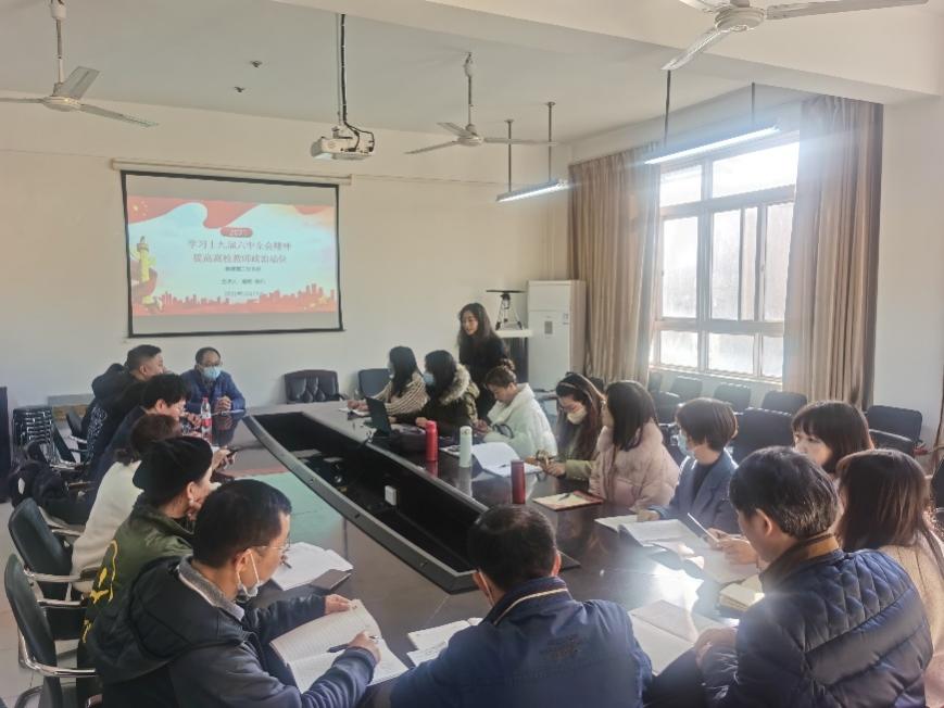 12月23日下午,管理学院教师第二党支部在学院会议室组织支部全体党员同志集中学习了党的十九届六中全会精神。会议由支部书记蔡璐主持。会上,蔡璐书记和组织委员陈凡分别做了以《学习党的十九届六中全会精神 提高高校教师政治站位》为主题的党课报告。