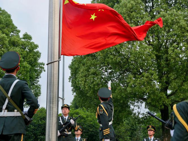 升旗仪式开始,校狼牙精英连国旗护卫队踏着整齐划一的步伐走向升旗台,全场肃立,奏唱国歌,鲜艳的五星红旗冉冉升起,在校园上空飘扬。