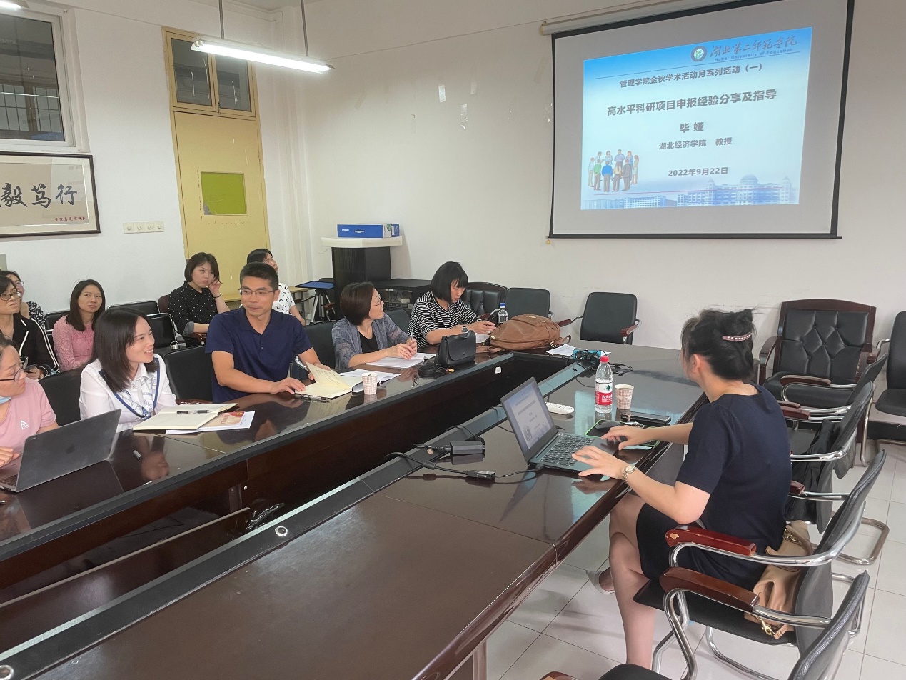 2022年9月22日下午,管理学院金秋学术月活动如期举行,学院邀请了湖北经济学院工商管理学院毕娅教授来院,为全体博士教师进行了高水平科研项目申报经验指导。讲座由管理学院副院长蔡璐副教授主持。