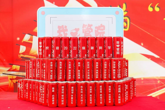 “我爱管院”、“欢迎2022级新同学”,细看定制可乐的红色瓶身,上面印着学校给新生的寄语,作为此次“迎新定制可乐”方案的负责人,管理学院分团委副书记徐梅馨说:“希望这定制的可乐可以给每一位新生带来该有的仪式感的同时,那寄语中的一字一句,更是予以新生快乐学习的期望。”