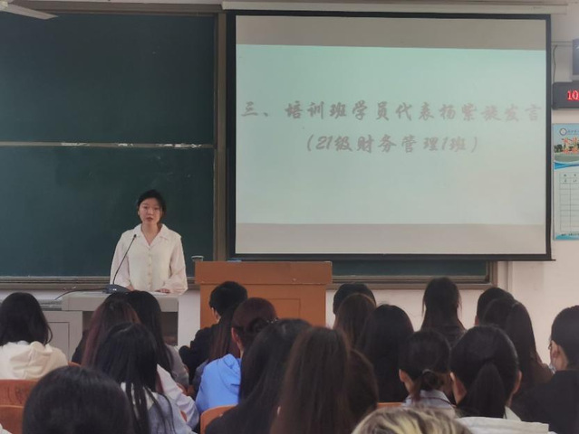 接着,入党积极分子学生代表21级财务管理1班杨紫璇发言。她首先讲述了在进入大学后,一直从思想、行动等多方面向党组织靠拢,积极响应学校号召,热爱校园活动,参加多种竞赛,投身志愿服务,不断地提升自我。随后,她总结过去一年的经验,在取得优异成绩的同时,在实践中坚定自我决心,不忘初心使命,锻炼担当和斗争精神,冲锋在前,为党和人民事业新征程上留下自己的足迹。最后提出号召“青年当奋斗努力,以梦为马,不负韶华,共迎二十的召开”。