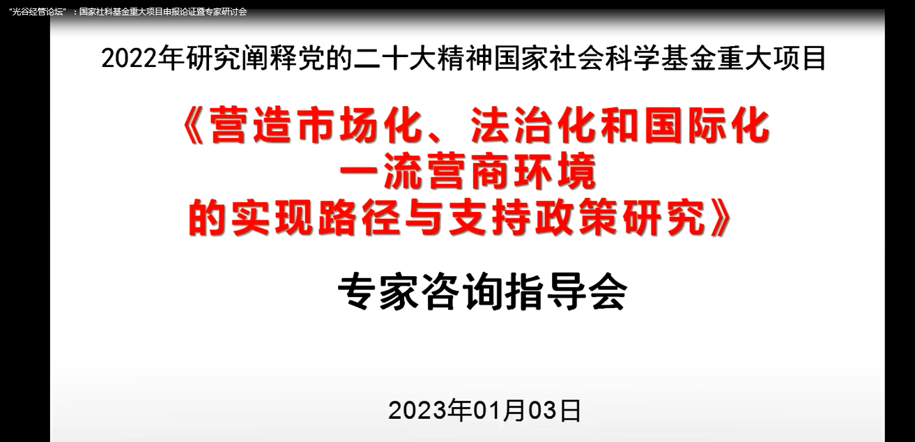 2023年1月3日下午,williamhill英国顺利召开2023年度研究阐释党的二十大精神国家社会科学基金重大项目《营造市场化、法治化和国际化一流营商环境的实现路径与支持政策研究》申报论证专家指导会暨“光谷经管论坛”第三期线上会议。