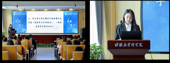 (图为徐梅馨老师宣读文件) (图为入党积极分子学员代表孔令格发言)