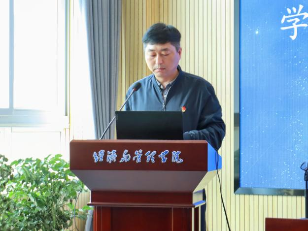 李京向在座师生介绍了陈池波教授的研究经历、学术成果以及本次主题教育活动的背景。李京指出,本场报告是“光谷经管论坛”第四期、学院春季入学教育“强信心、创未来”系列教育活动的首场报告,旨在引导全院师生深入学习贯彻党的二十大精神和全国两会精神。
