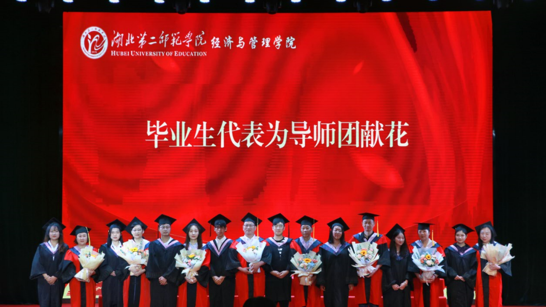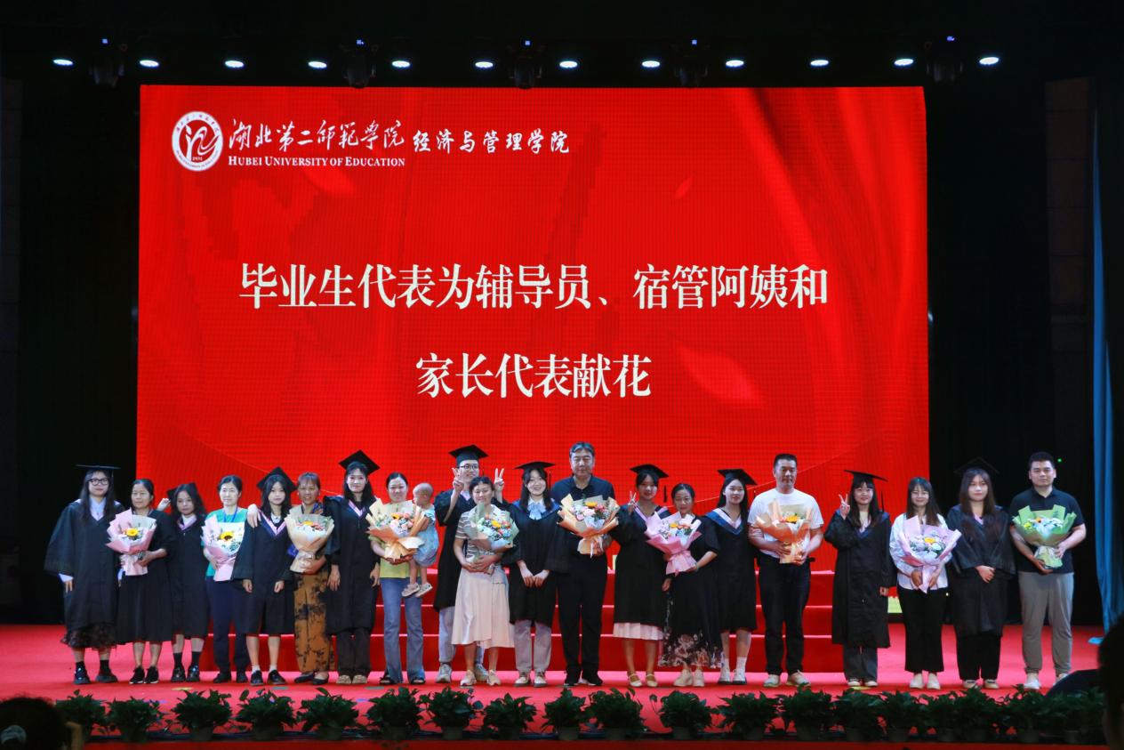 毕业生代表为导师团、辅导员、宿管阿姨和家长代表献花。经管学院院长陈池波在讲话中对毕业生们以优异成绩顺利毕业表示祝贺,并感谢他们对学院、对老师给予的理解、信任与支持,同时希望他们在新征程上,炼就不一样的人生,开启属于青年一代的未来。