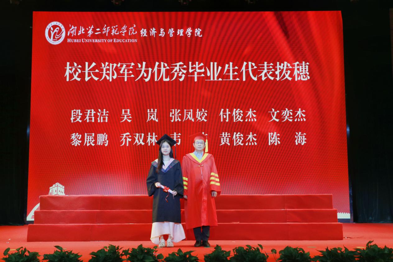 经管学院副院长陈艳明宣读《关于授予2023届普通本科毕业生学士学位的决定》,校长郑军为优秀毕业生代表拨穗并授予学位。