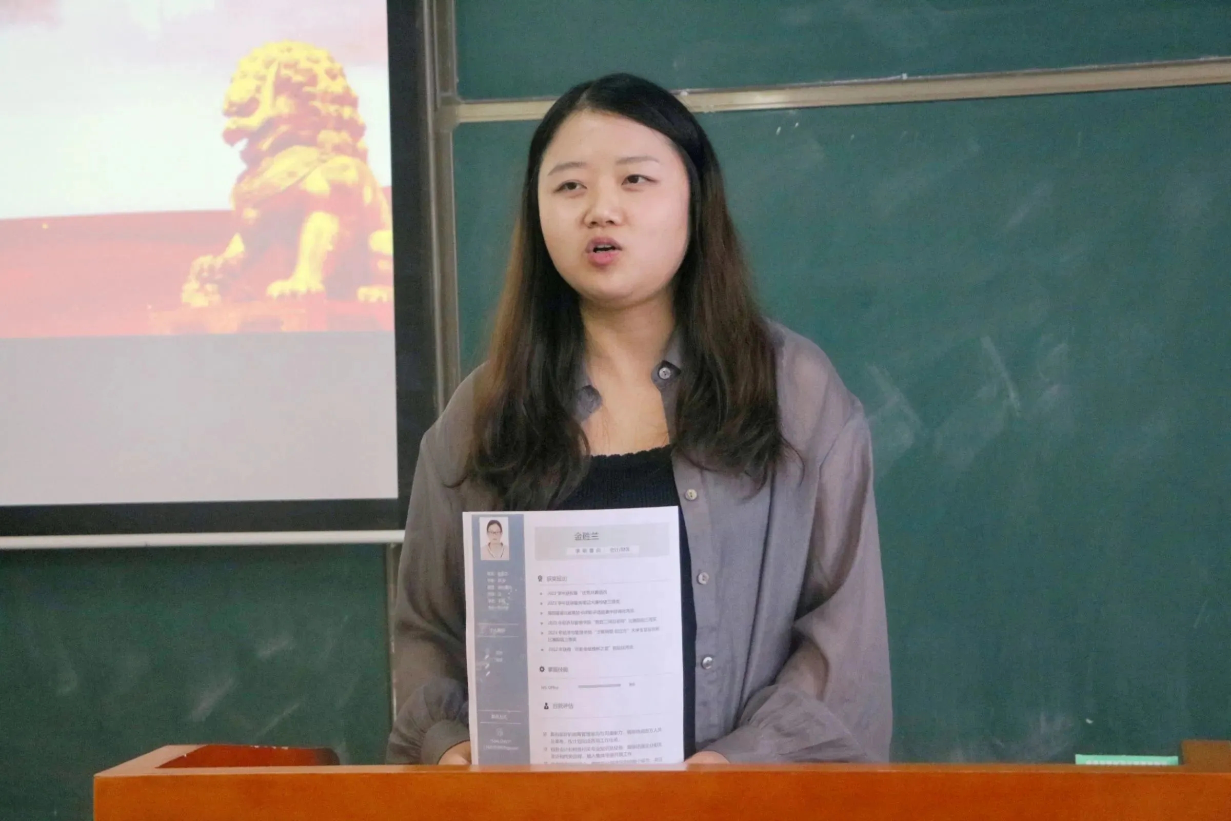 比赛伊始,主持人介绍比赛规则以及评分细则,比赛采用百分制形式,从简历内容,仪表仪态,语言表达现场效果四个方面进行评分作为最终成绩。参赛选手按照顺序依次上台进行自我陈述。选手们从求职意向、自身优势、实习经验等方面来突出自己的优势。