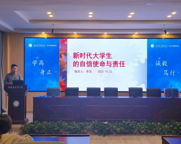 李京阐述了新时代大学生所需的自信,分别是:对马克思主义的自信、对中国特色社会主义的自信以及对自我的自信。他通过引用习近平总书记《论党的青年工作》的相关内容和“90”后副院长刘明侦的案例向入党积极分子们展示青年的重要性以及青年有着强大力量,激励同学们对自我的充分肯定与自信。