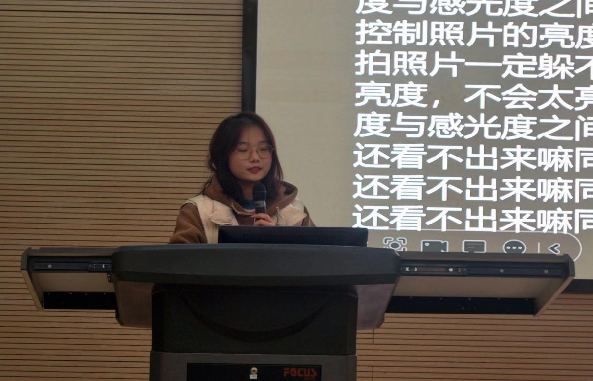 黄飘讲述摄影的相关内容。她从摄影的基础和新闻摄影的简析两个部分展开介绍,黄飘向各部门成员讲解摄影知识,介绍相机基本握持方式、新闻文体摄影构图方法,强调曝光三要素即光圈、快门、感光度重要性,并从三个方面阐释照片模糊的原因及解决方法,通过举例的方式介绍新闻文体四大基本特点和三大信息素,此外她还指出一些新闻摄影的注意事项,并列举相关实例。同学们认真听讲,书写笔记,拍照记录。课后,同学们将课堂照片和课堂笔记上传。