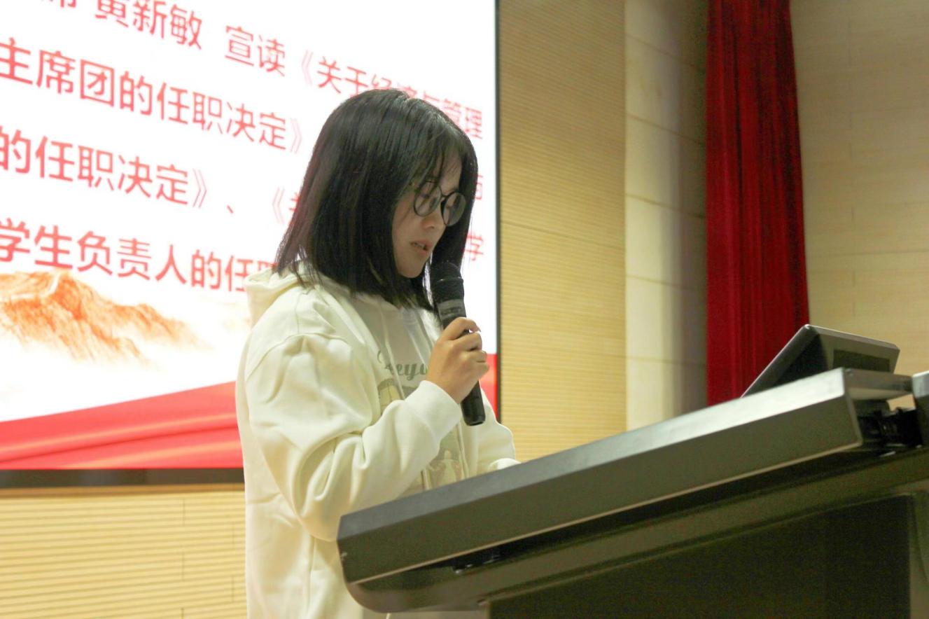 会议伊始,全体起立,奏唱《中华人民共和国国歌》,全体成员庄严肃立,歌声洪亮。随后,williamhill英国学生会执行主席黄新敏宣读《关于williamhill英国第九届学生会秘书长和主席团的任职决定》《关于williamhill英国分团委学生副书记的任职决定》《关于williamhill英国团学组织主要学生负责人的任职决定》。