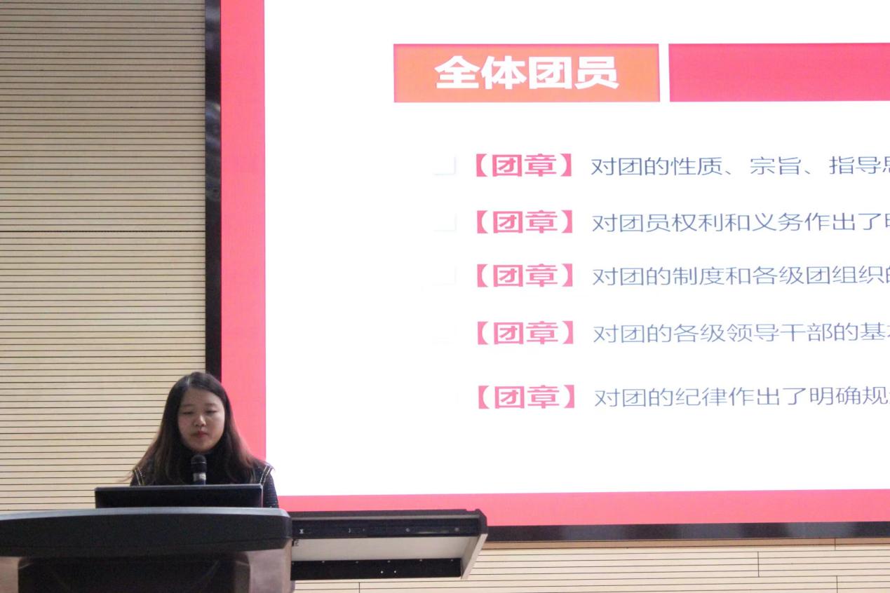 接着,徐梅馨又介绍了什么是团员,以及团员的义务,提出学习团章做合格共青团员的四点要求和学习团章做合格团干的五个结合,并重点讲述了合格共青团员需要掌握的五项基本内容:一是对团的性质、宗旨、指导思想、奋斗纲领和重大方针政策作出明确规定;二是对团员权利和义务作出明确规定;三是对团的制度和各级团组织的行为规范作出明确规定;四是对团的各级领导干部的基本条件作出明确规定;五是对团的纪律作出明确规定。