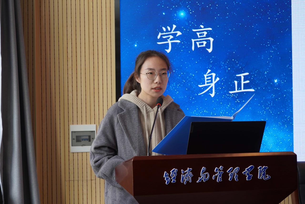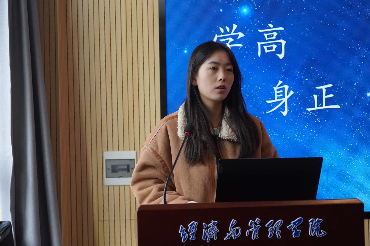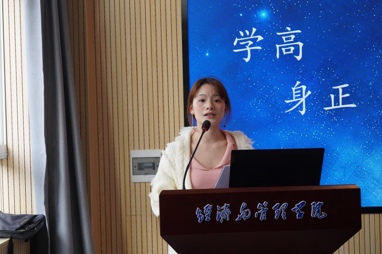 2022-2023学年国家奖学金获得者、21级国际经济与贸易专业2班邢娜从求学、奋进、开拓、奉献四个方面出发,向在场的学弟学妹们分享经验,告诉同学们,在大学期间,要注重身体健康,要有目的学习,合理安排时间,在学习的过程中保持深度思考,抓重点,学会提问,及时复盘所学知识并运用于实践。