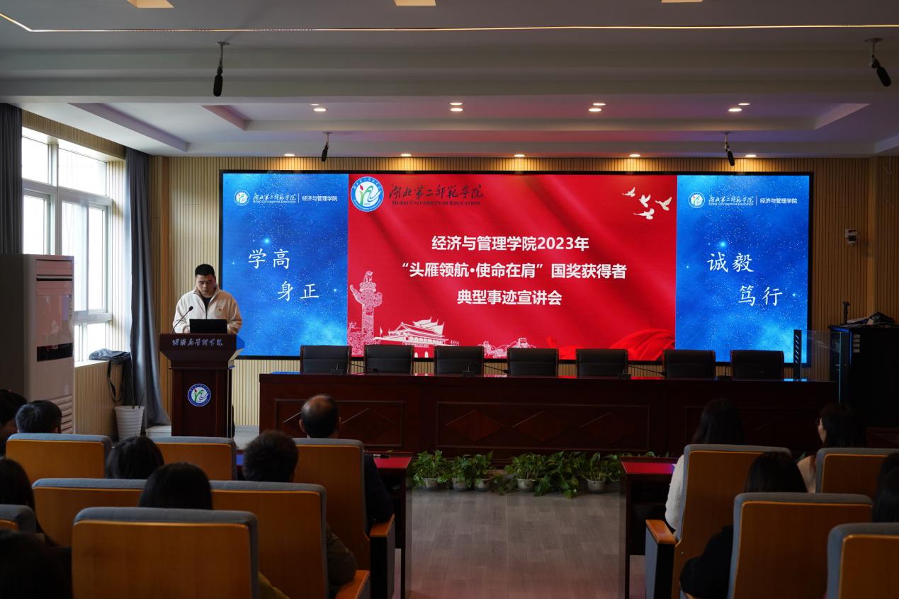 2022-2023学年国家奖学金获得者、20级物流管理1班范凯从立大志、成大才、担大任三个方面分享自己的成长故事。她提出要扎根社会民情,立足社会实践,只有对社会民情有敏感的洞察力,了解民之所想,才能通过自己的力量满足人民所需。要聚焦多维提升,探索学科真知,提高思想格局,强化榜样力量。只有不断实践,探索真知,才能更好地提升自我。