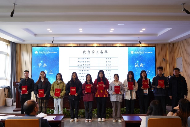 学生第三党支部组织委员兼宣传委员李婷宣读优秀学员名单。周慧东为入党积极分子培训班优秀学员颁发荣誉证书;李京为发展对象培训班优秀学员颁发荣誉证书;刘元锋为预备党员培训班优秀学员代表颁发荣誉证书。
