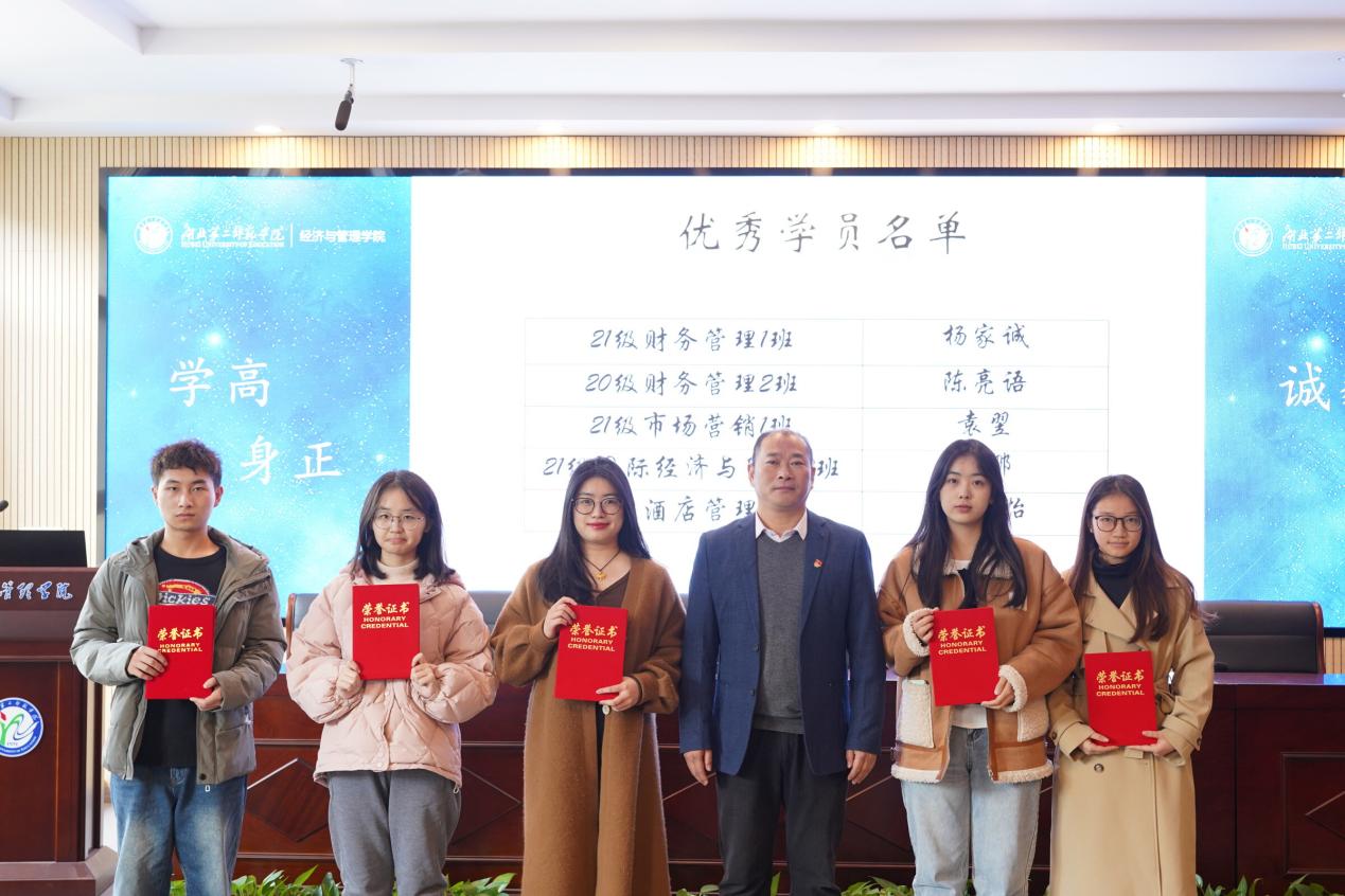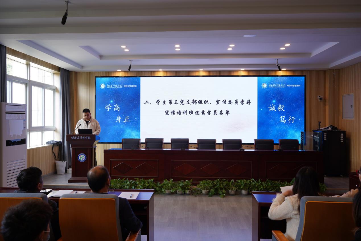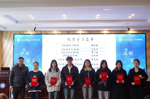入党积极分子培训班优秀学员代表、22级国贸2班韩歌,发展对象培训班优秀学员代表、21级财管1班郭晓婷分别发言。2022-2023年国家奖学金获得者,20级物流管理1班范凯、20级市场营销1班王妍群、21级国际经济与贸易2班邢娜分别分享在学习及团队协作方面的经验。