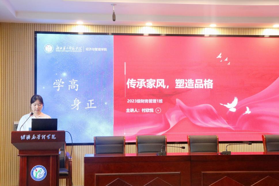 其中,21级财务管理1班杨紫璇向大家讲述了18级酒店管理1班陈标现参与西部计划服务西藏的故事,号召大家向榜样学习,积极传承我院优秀学长、学姐的奋斗精神,汲取力量再创辉煌。23级财务管理1班付欣悦以“传承家风,塑造品格”为主题的宣讲帮助我院学子明确人生方向,增强自信心。