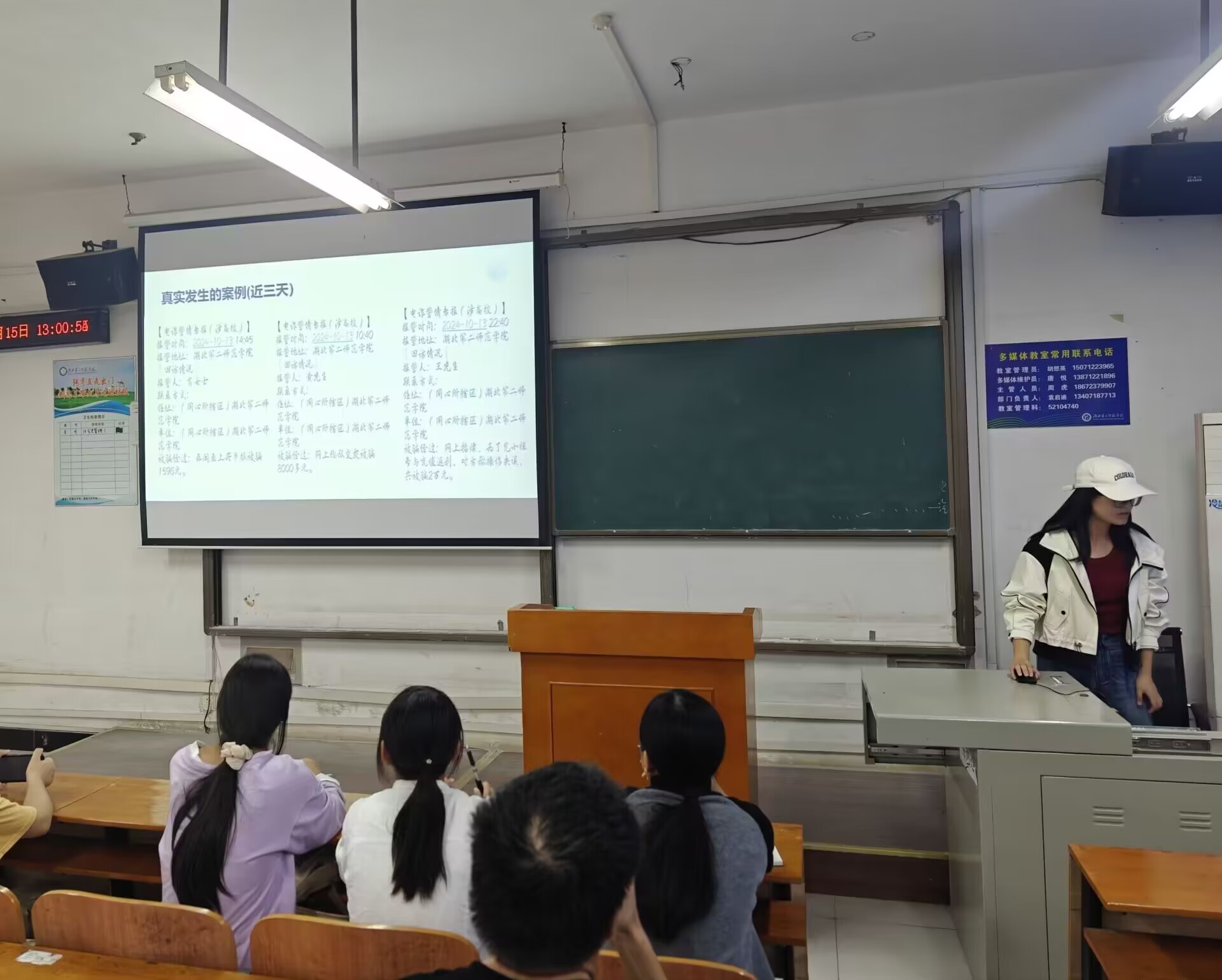 随后,她通过展示学校近三天发生的真实案例,向学生普及电信网络诈骗等常见的诈骗形式,提醒他们在学习与生活中做好多方位的预防,保护财产安全,警惕此类情况的再发生,提高他们的防诈骗意识。