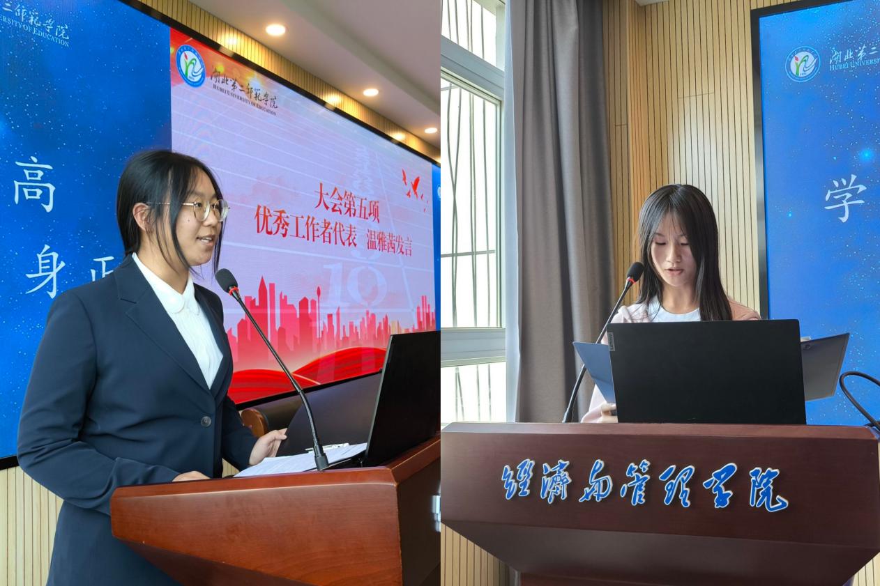 优秀工作者代表温雅茜、优秀运动员代表吴婧瑞分别代表受表彰个人发言。