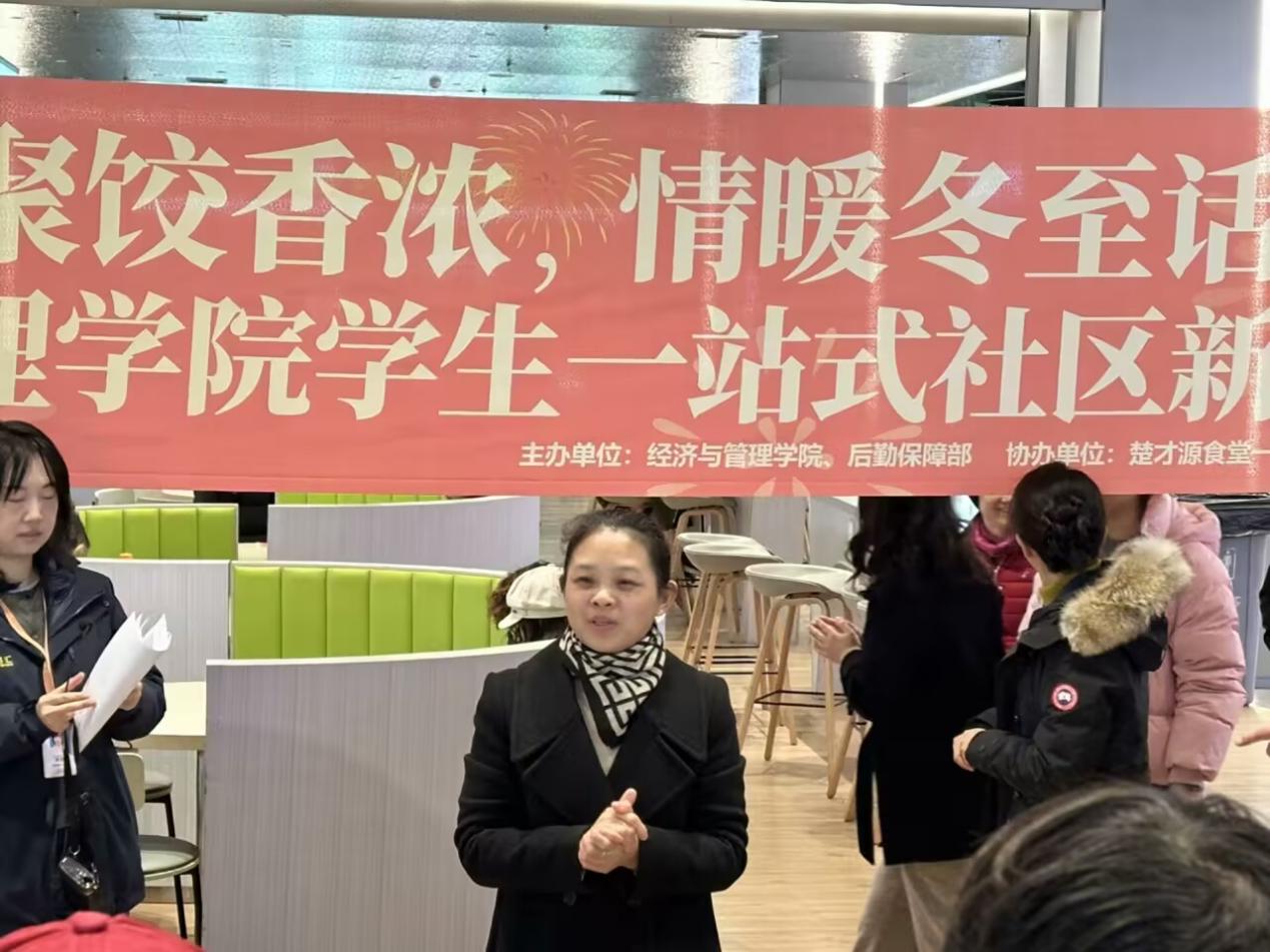 本网讯(通讯员 刘志杰)岁寒又冬至,团圆正当时。为进一步弘扬中国优秀传统文化,增强学生凝聚力和归属感,12月20日下午,williamhill英国(以下简称“经管院”)于楚才源食堂一楼开展主题为“师生共聚饺香浓,情暖冬至话团圆”的学生一站式社区新年活动。学生工作部、人民武装部部长文敏,审计处处长宋金江,后勤保障部党总支书记刘晖,后勤保障部部长吴晓健,财务处副处长王勇、刘杰,经管院党委副书记李京、副院长常静、学工办主任周慧东出席本次活动。