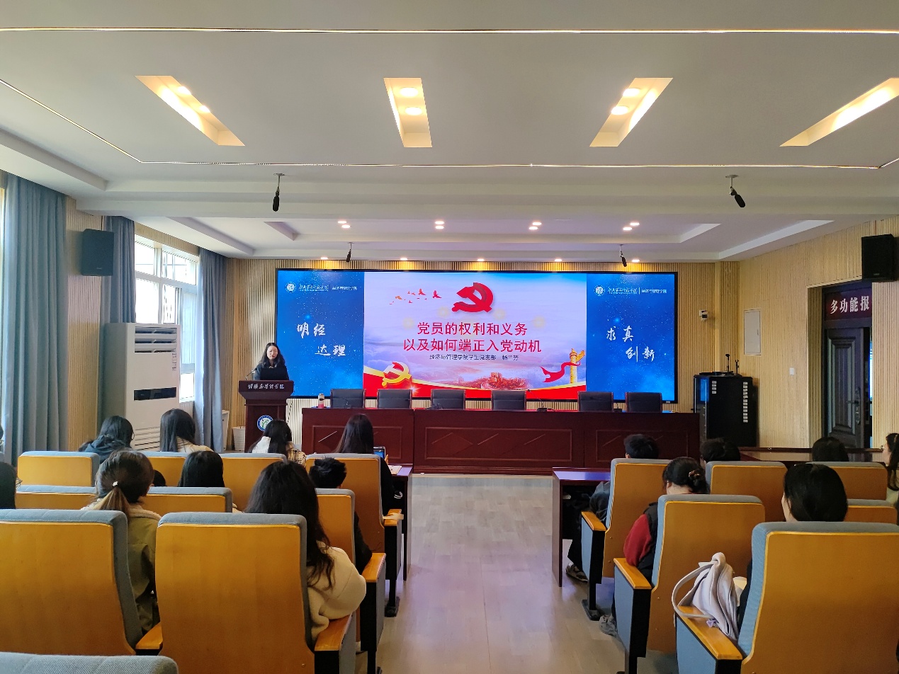 本网讯(见习记者 汪雅雯)3月19日中午,williamhill英国(以下简称“经管院”)分党校发展对象培训班在2号楼三楼多功能报告厅开展“党员的权利与义务以及如何端正入党动机”主题课程,分党校发展对象培训班全体学员参加,经管院学生第一党支部纪检委员杨兰芳进行本次授课。