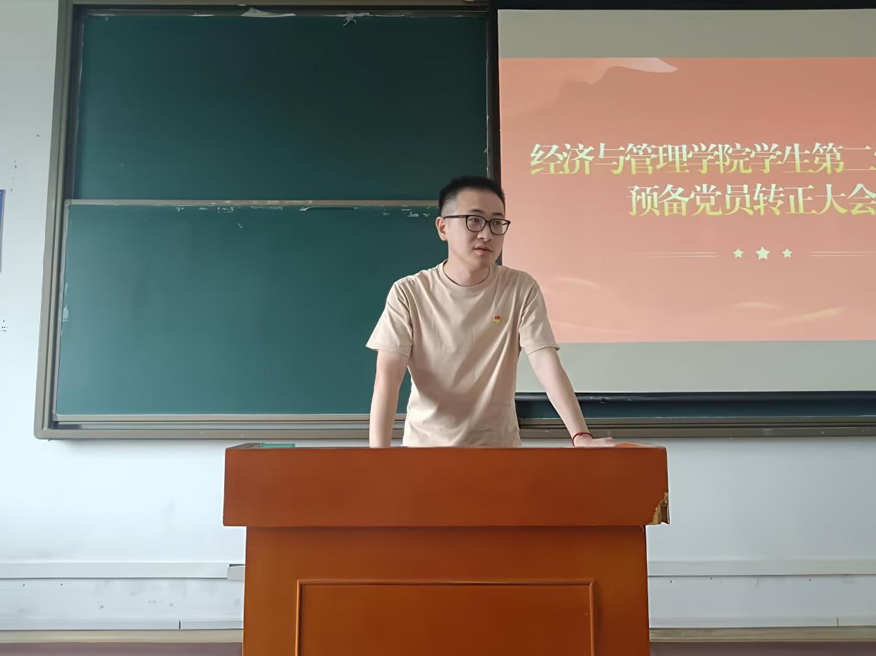 会议接近尾声,学生第二党支部书记姜炜向新党员寄语,转正是政治生命的新起点,全体党员要始终以习近平新时代中国特色社会主义思想为指导,增强“四个意识”、坚定“四个自信”、做到“两个维护”,发挥先锋模范作用,以实际行动践行入党誓词。