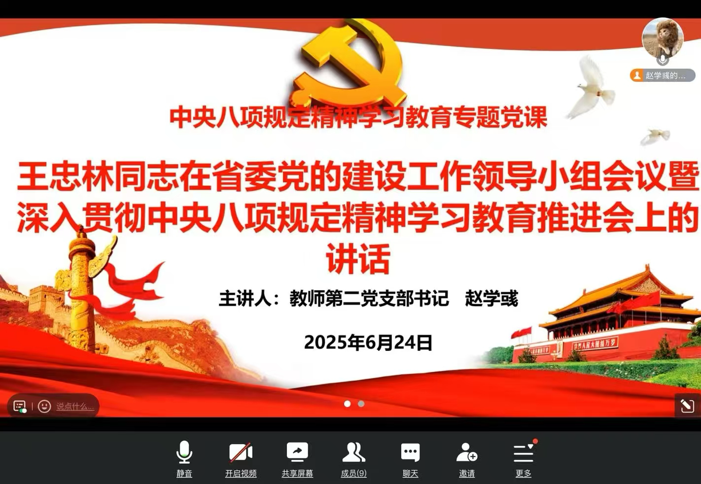 本网讯(通讯员 王迪)6月24日,教师第二支部开展贯彻落实中央八项规定精神专题党课活动,集中学习王忠林同志在省委党的建设工作领导小组会议暨深入贯彻中央八项规定精神学习教育推进会上的讲话。支部书记赵学彧同志带领全体党员深入领会讲话要义,强调要始终保持作风建设永远在路上的政治自觉,锲而不舍落实中央八项规定精神。