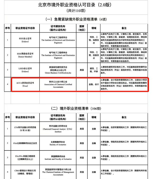 1)ACCA资深会员证书(FCCA)入选北京市境外职业资格认可目录2.0急需紧缺境外职业资格清单