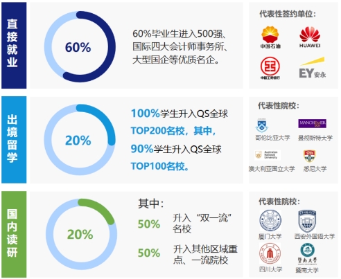 第三层次培养目标:就业与升学赋能。聚焦职业竞争力锻造与多元发展赋能,构建 “三位一体” 成长体系。通过沉浸式专业实践、名企资源对接及行业前沿课程,助力学生精准锁定职业赛道,斩获知名会计师事务所、财务管培生等高端岗位offer;同步搭建学术提升平台,配备考研及考公规划老师进行规划指导,让学生系统性的了解考研及考公规划;依托 ACCA 国际资质优势,联动海外合作院校资源,为学生开辟留学深造绿色通道,全方位筑牢学生在职业发展、学术进阶与国际交流中的核心竞争力。提升ACCA实验班学生高质量就业,为学生考研、考公和出国留学生提供坚实的基础和必要保障。